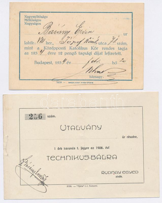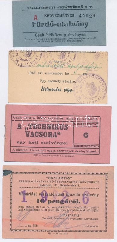 cca 1926-1943 Vegyes utalvány, jegy tétel(Csillaghegyi Árpádfürdő, Technikus vacsora, élelmezési jegy, igazoló szelvény tagsági díj befizetéséről, stb.), 6 db