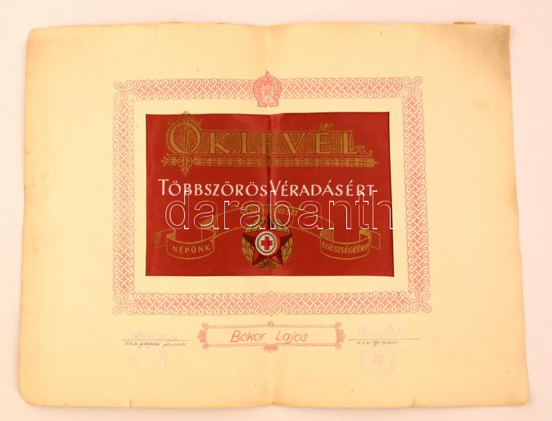 cca 1950 Magyar Vöröskereszt oklevél többszörös véradásért, aláírásokk... https://www.darabanth.com/hu/274-Gyorsarveres/274.0/Festmeny-mutargy-papirregiseg-egyeb/Okmanyok~16/cca-1950-Magyar-Voroskereszt-oklevel-tobbszoros-veradasert-alairasokkal-szakadasokkal~II1400404