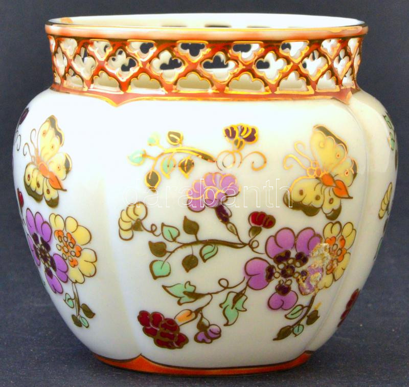 Leírás: Zsolnay kaspó, porcelán, kézzel festett, jelzett, hibátlan, 10x9cm