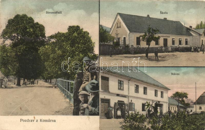 Leírás: Komárom, Komárno; iskola, sétány, tér, Josef Praslica üzlete; cseh nyelvű képeslap / Stromoradí, Skola, Náves / school, square, alley, shop