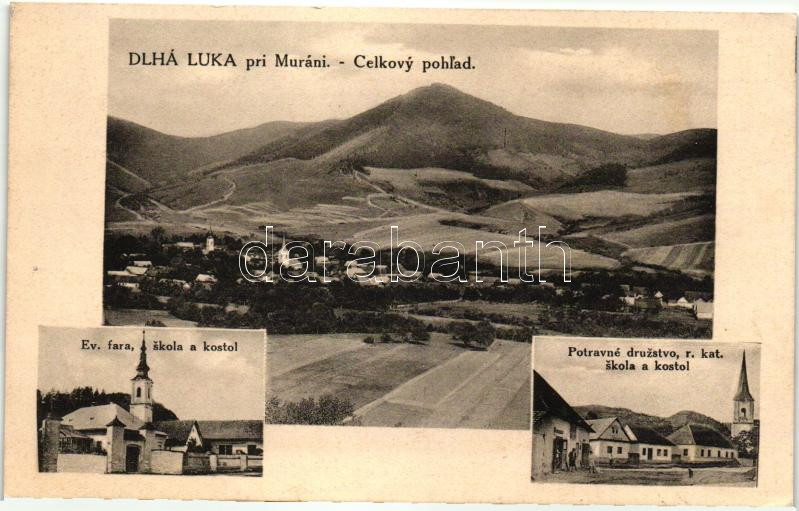 Murányhosszúrét, Muránska Dlhá Lúka; Evangélikus templom, iskola és paplak, Római katolikus templom és iskola, élelmiszer szövetkezet / churches, schools, rectories, shop
