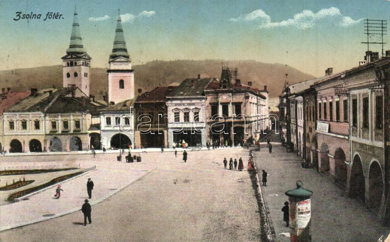 Zsolna, Zilina; Főtér, templom, Spanyol Gábor üzlete (kopott sarkak / ... https://www.darabanth.com/hu/274-Gyorsarveres/274.0/Kepeslapok/Felvidek~400008/Zsolna-Zilina-Foter-templom-Spanyol-Gabor-uzlete-kopott-sarkak-worn-edges~II1401162