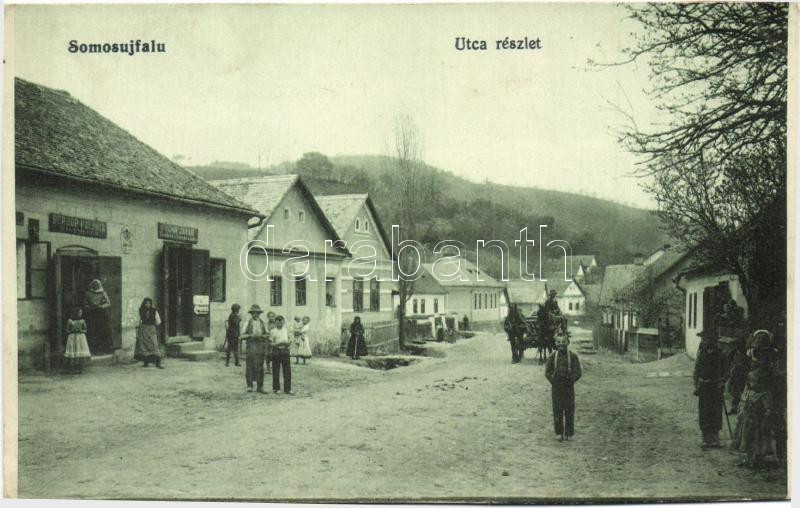 Leírás: Somosújfalu, utca, Bor, sör és pálinka mérés, Kohn Jakab üzlete, kiadja Friedler Samu (vágott / cut)