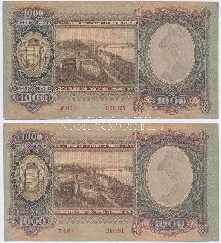1943. 1000P (2x) nyomdai papírráncokkal T:III https://www.darabanth.com/hu/274-Gyorsarveres/274.0/Numizmatika/Magyar-bankjegyek~200011/1943-1000P-2x-nyomdai-papirrancokkal-TIII~II1398630
