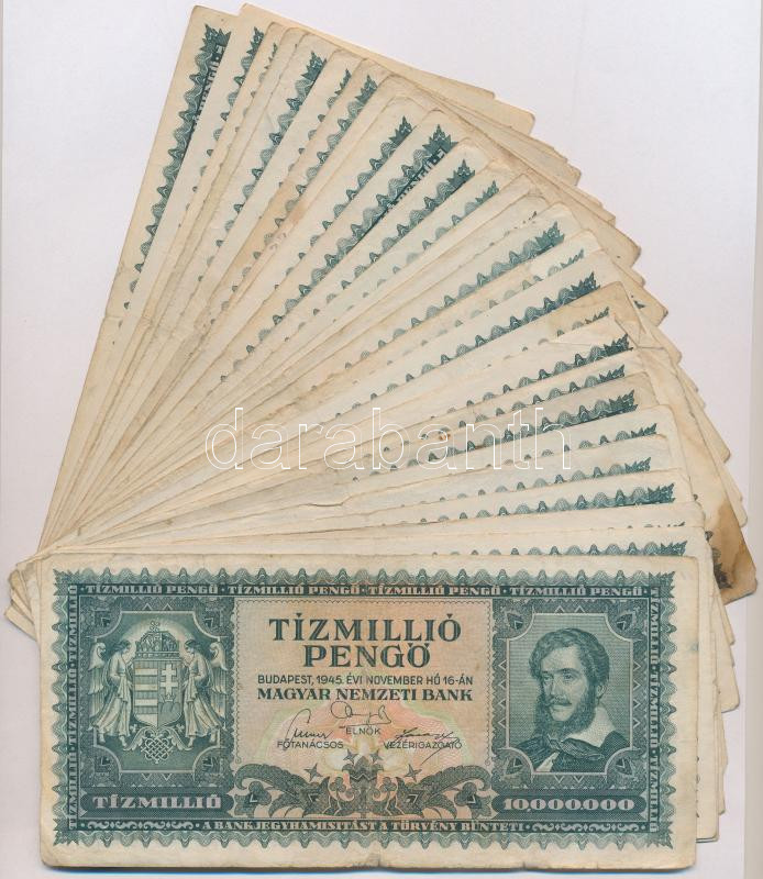 1945. 10.000.000P (30x) T:III,III- https://www.darabanth.com/hu/274-Gyorsarveres/274.0/Numizmatika/Magyar-bankjegyek~200011/1945-10000000P-30x-TIII-III-~II1399809