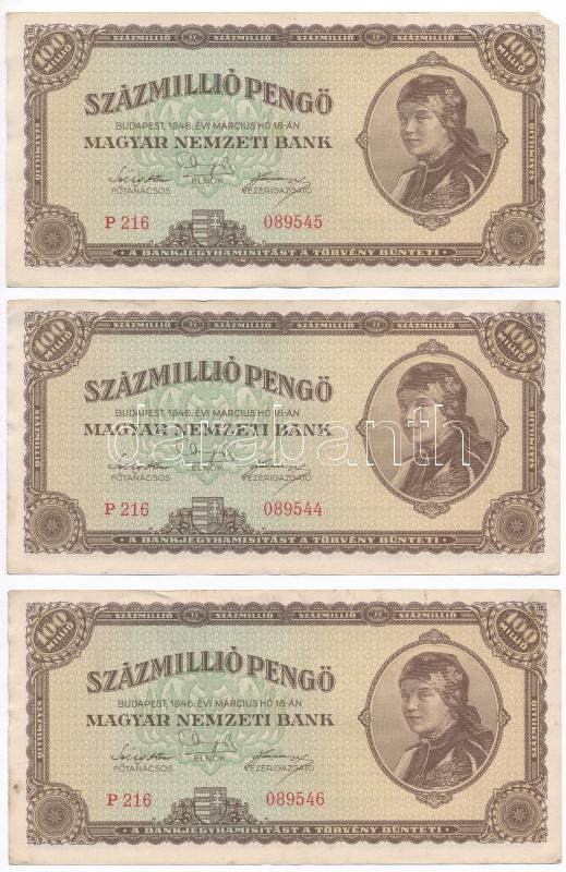 1946. 100.000.000P (5x) sorszámkövetők T:I-,II Adamo P27 https://www.darabanth.com/hu/274-Gyorsarveres/274.0/Numizmatika/Magyar-bankjegyek~200011/1946-100000000P-5x-sorszamkovetok-TI-II-Adamo-P27~II1397862