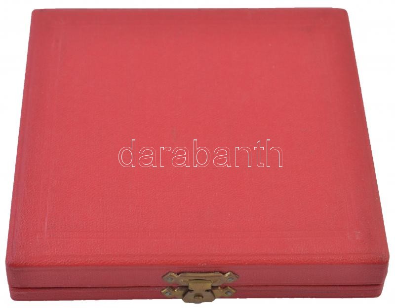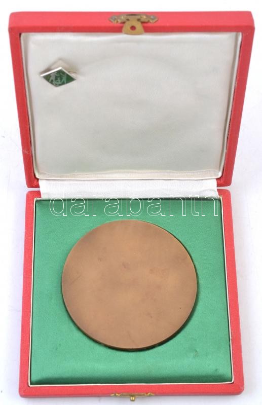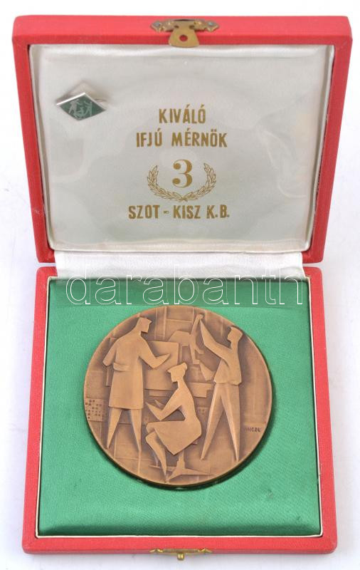 Vincze Dénes (1914-1972) ~1960. Bronz fém szocreál plakett eredeti zöld dísztokban, hozzá tartozó jelvénnyel, "Kiváló Ifjú Mérnök 3. SZOT-KISZ K.B." fóliával (81mm) T:2
