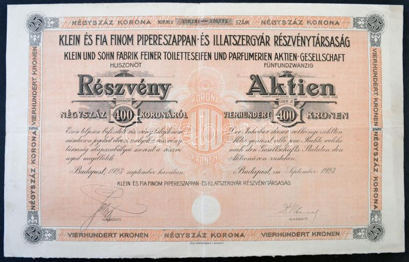 Leírás: Budapest 1923. "Klein- és Fia Finom Pipereszappan- és Illatszergyár Részvénytársaság" 25 részvénye egyenként 400K-ról szelvényekkel T:III fo.
