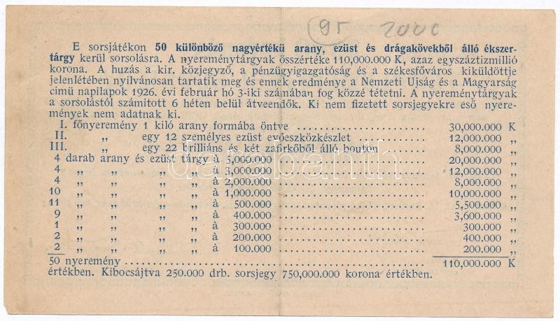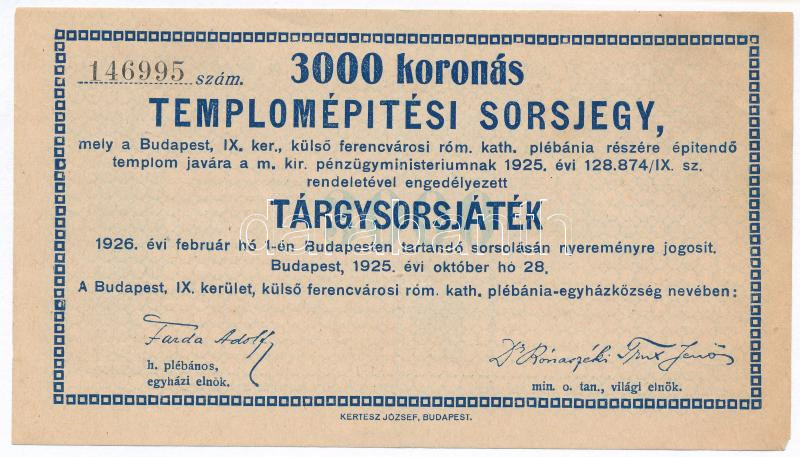 Leírás: Budapest 1925. "Templomépítési sorsjegy" 3000K-ról, a Budapest, IX. kerületi római katolikus plébánia javára T:II