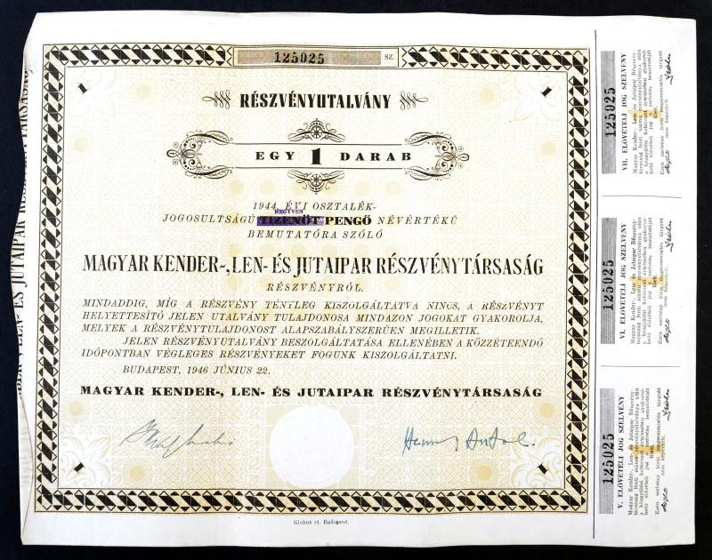 Budapest 1946. "Magyar Kender-, Len- és Jutaipar Részvénytársaság" rés... https://www.darabanth.com/hu/274-Gyorsarveres/274.0/Numizmatika/Reszvenyek-es-sorsjegyek~200008/Budapest-1946-Magyar-Kender--Len-es-Jutaipar-Reszvenytarsasag-reszvenyutalvany-40P-rol~II1396481