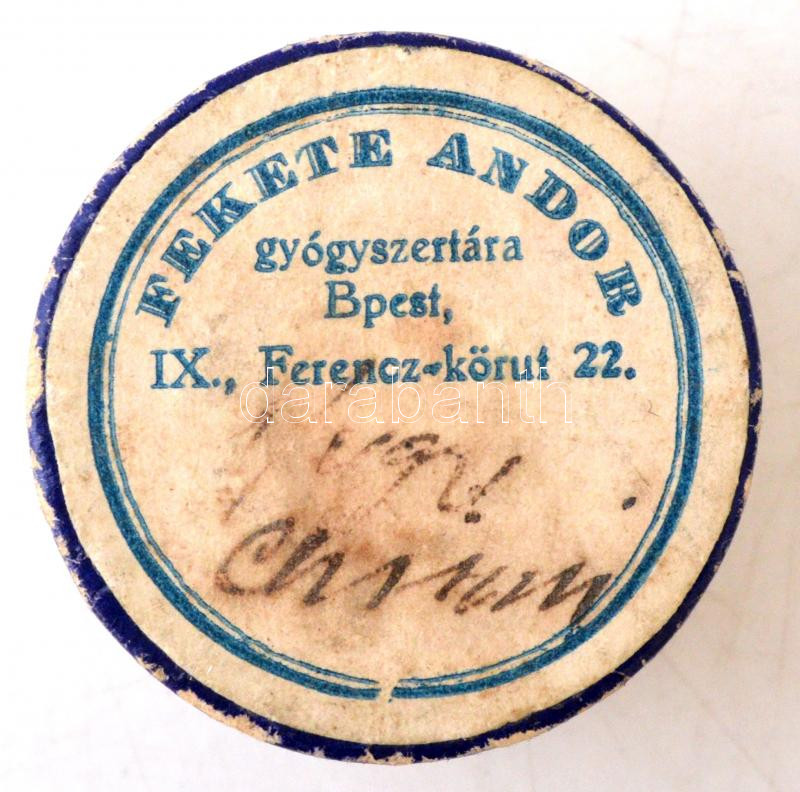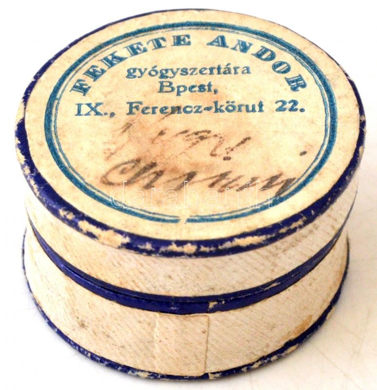 "Fekete Andor" gyógyszertára papír doboz, 3,5x2cm https://www.darabanth.com/hu/275-Gyorsarveres/275.0/Festmeny-mutargy-papirregiseg-egyeb/Bolhapiac~200233/Fekete-Andor-gyogyszertara-papir-doboz-3-5x2cm~II1402236