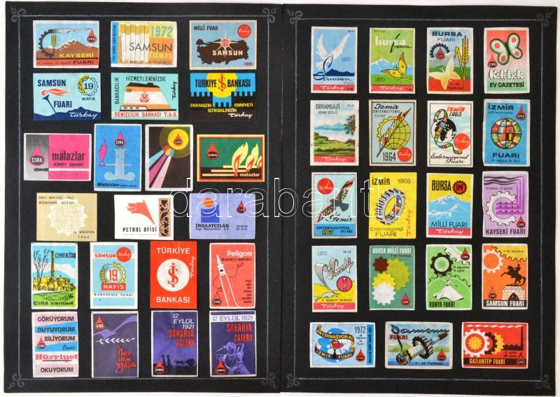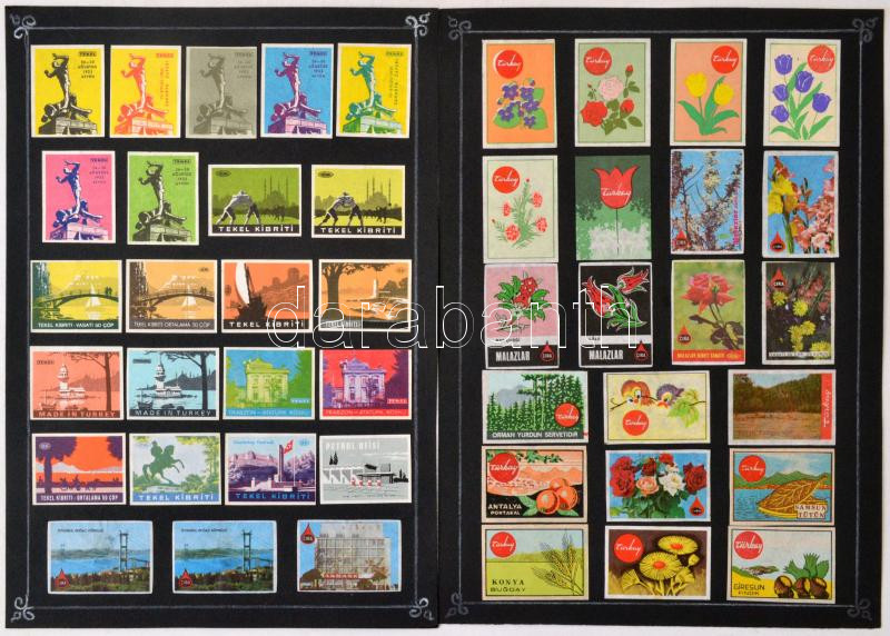 Leírás: Török gyufacímke gyűjtemény:virágok, épületek, madarak, halak, stb. témában, 11db kartonon, 229db, különböző méretben