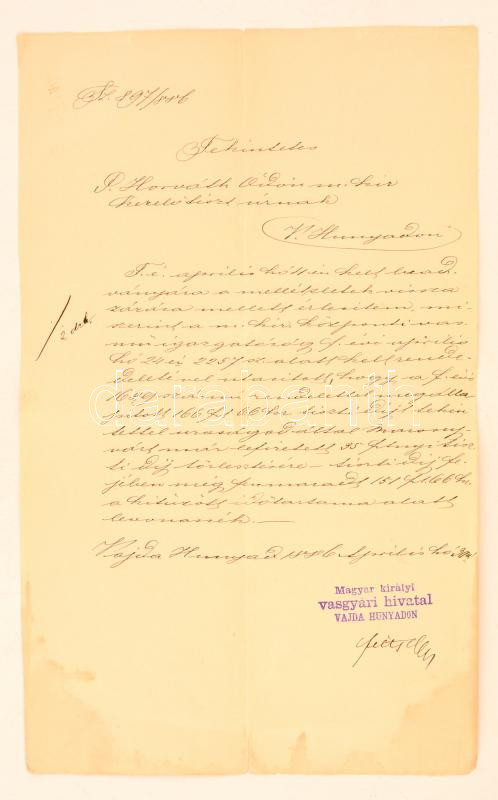 1886 Vajdahunyad, A Magyar Királyi Vasgyári Hivatal által küldött levé... https://www.darabanth.com/hu/275-Gyorsarveres/275.0/Festmeny-mutargy-papirregiseg-egyeb/Okmanyok~200238/1886-Vajdahunyad-A-Magyar-Kiralyi-Vasgyari-Hivatal-altal-kuldott-level~II1406126