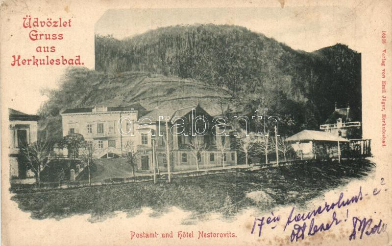 Leírás: Herkulesfürdő, Herkulesbad; Postamt und Hotel Nestorovits, Verlag von Emil Jäger / post office, hotel