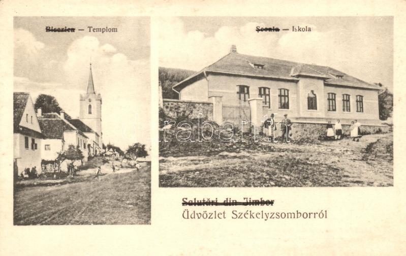 Székelyzsombor, Jimbor;Templom, iskola / church, school https://www.darabanth.com/hu/275-Gyorsarveres/275.0/Kepeslapok/Erdely~400011/Szekelyzsombor-Jimbor-Templom-iskola--church-school~II1404843