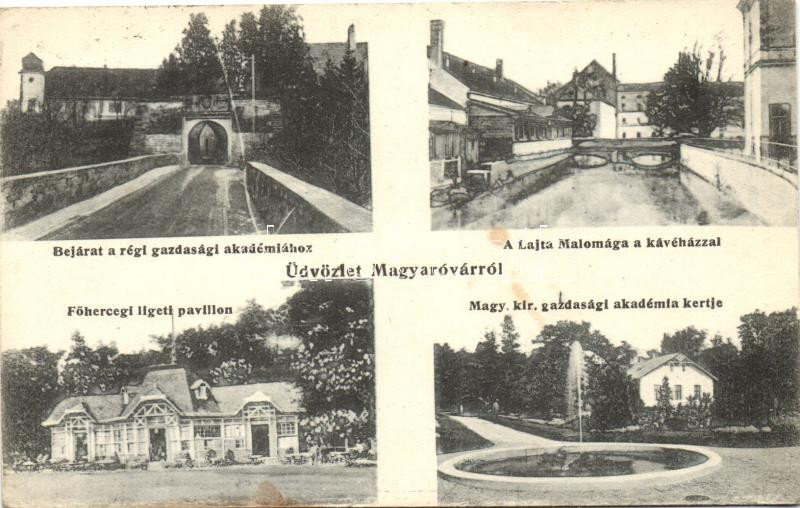 Mosonmagyaróvár, Magyaróvár; Bejárat a régi gazdasági akadémiához, A Lajta Malomága a kávéházzal, Főhercegi ligeti pavilon, Magyar kir. gazdasági akadémia, kiadja a Turán papírkereskedés (EK)