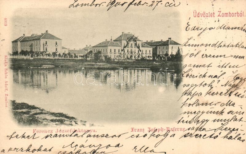 Zombor, Sombor; Ferenc József laktanya, kiadja Schön Adolf / military ... https://www.darabanth.com/hu/275-Gyorsarveres/275.0/Kepeslapok/Vajdasag~400016/Zombor-Sombor-Ferenc-Jozsef-laktanya-kiadja-Schon-Adolf-military-barracks~II1402699