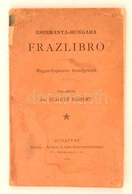 Dr. Schatz Róbert: Esperanta-hungara frazlibro. Magyar-esperanto beszélgetések. Budapest, 1909, Kókai Lajos könyvkereskedése, 51 p. Kiadói papírkötés. Megviselt állapotban. A magyar eszperantó történetében úttörőnek számító társalgási zsebkönyv.
