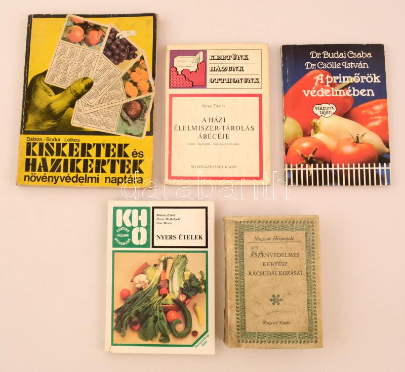 Vegyes kertészeti témájú könyvek, 5 db: Surányi Dezső (szerk.): A szenvedelmes kertész rácsudálkozásai. Dokumentumok a magyar kertkultúra évezredes történetéhez. Magyar hírmondó. Budapest, 1982, Magvető. Kiadói papírkötés. Volt könyvtári példány. Martin Zobel-Horst Weibelzahl-Lisa Mrose: Nyers ételek. Kertünk, Házunk, Otthonunk. Budapest, 1984, Mezőgazdasági Kiadó. Kiadó papírkötés. Sáray Tamás: A házi élelmiszer-tárolás ábécéje. (Hűtés, fagyasztás, hagyományos tárolás.) Kertünk, Házunk, Otthonunk.Budapest, 1974, Mezőgazdasági Kiadó. Kiadói papírkötés. Dr. Budai Csaba-Dr. Csölle István: A primőrök védelmében. A zöldség- és dísznövényhajtás növényegészségügye. Budapest, 1989, Mezőgazdasági Kiadó. 2., átdolgozott kiadás. Kiadói papírkötés. Balázs Klára-Bodor János-Lelkes Lajos: Kiskertek és házikertek növényvédelmi naptára. Budapest, 1975, Mezőgazdasági Kiadó. 2, átdolgozott és bővített kiadás. Kiadói papírkötés.