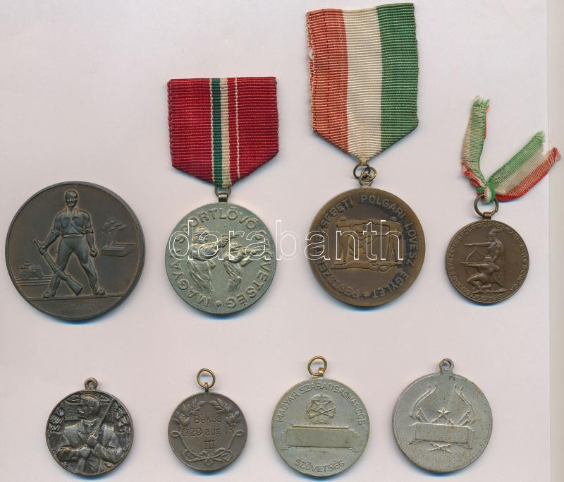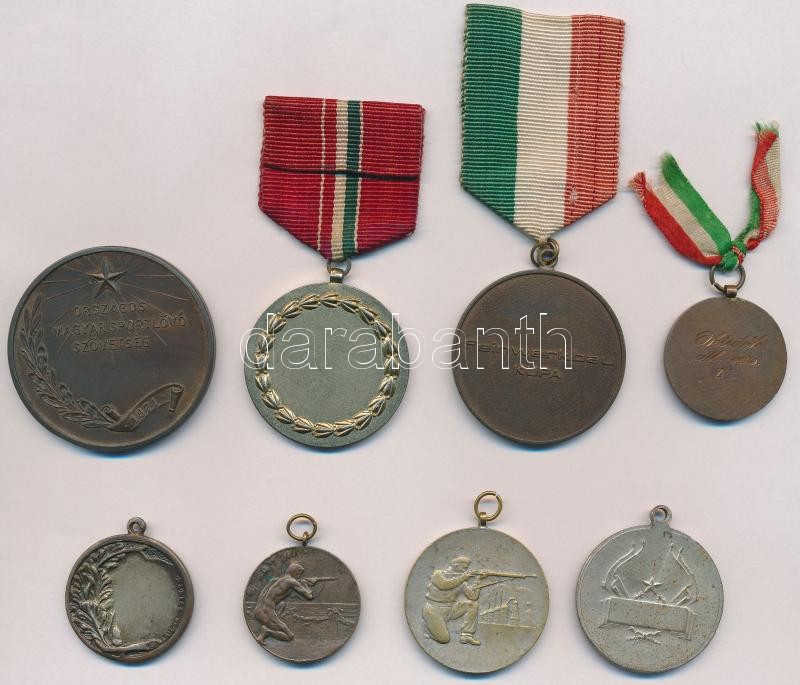 Leírás: ~1930. "Budapest Székesfővárosi Levente Egyesületek" Br érem. Szign.: Boskol L. (30mm) + ~1950. "Országos Magyar Sportlövő Szövetség - 1871 / Hadipuska III" Br díjérem (50mm) + DN "Magyar Sportlövő Szövetség" fém díjérem (40mm) + ~1930-1940. "Pestszenterzsébeti Polgári Lövész Egylet / Feinwerkbau Kupa" Br díjérem (42,5mm) + ~1950. "Magyar Szabadságharcos Szövetség" ezüstözött Br díjérem (36mm) + 3db klf lövész díjérem