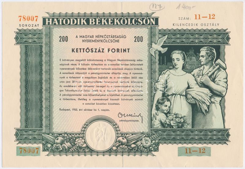 Leírás: 1955. "Hatodik Békekölcsön" nyereménykölcsön 200Ft-ról szárazpecséttel T:II-