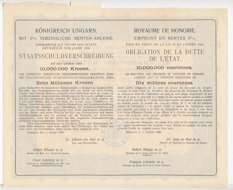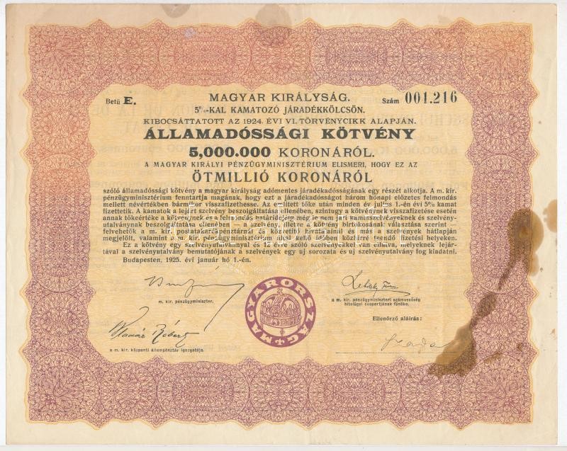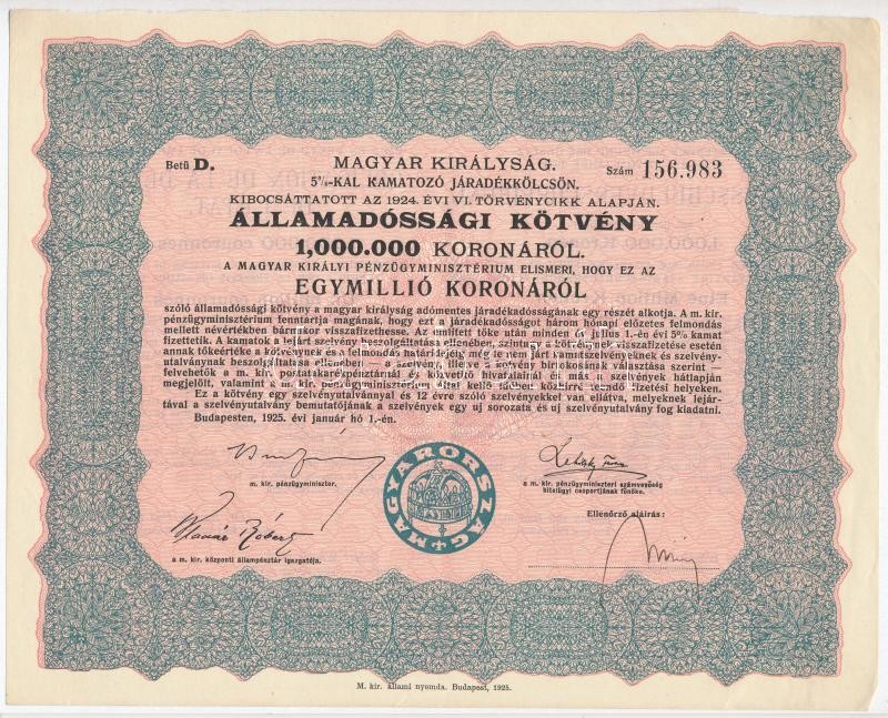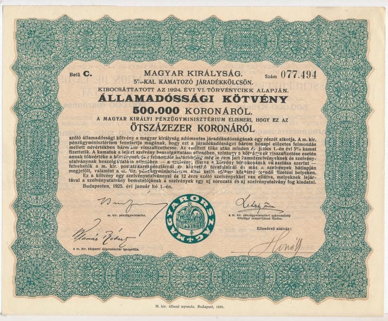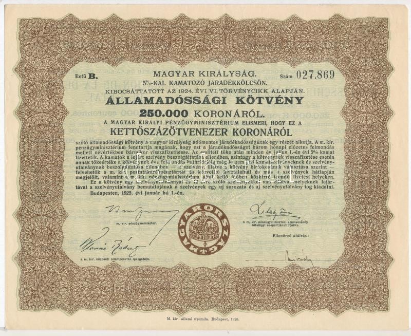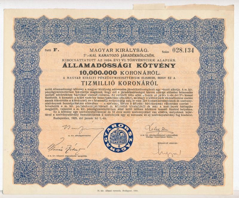 Leírás: Budapest 1925. "Magyar Királyság 5%-kal kamatozó Járadékkölcsön Államadóssági Kötvény" 125.000K, 250.000K, 500.000K, 1.000.000K, 5.000.000K és 10.000.000K-ról szelvények nélkül T:II-III egyiken fo.