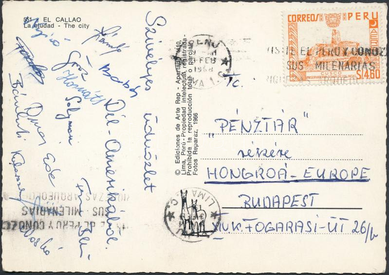 Leírás: 1968 Az Újpest labdarúgóinak (Bánkuti, Nyírő, Dunai, Noskó, Zámbó és mások) aláírásai Peruból küldött levelezőlapon