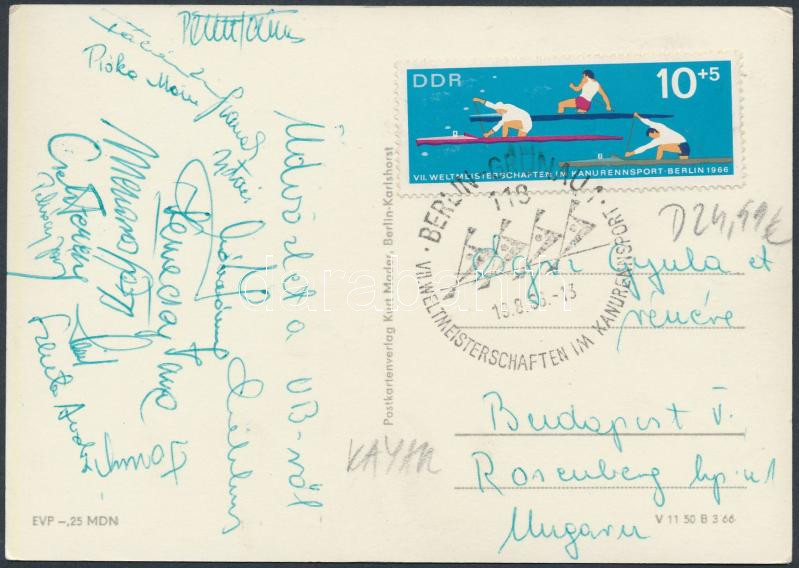 Leírás: 1986 A magyar evezős válogatott tagjainak aláírásával hazaküldött lap