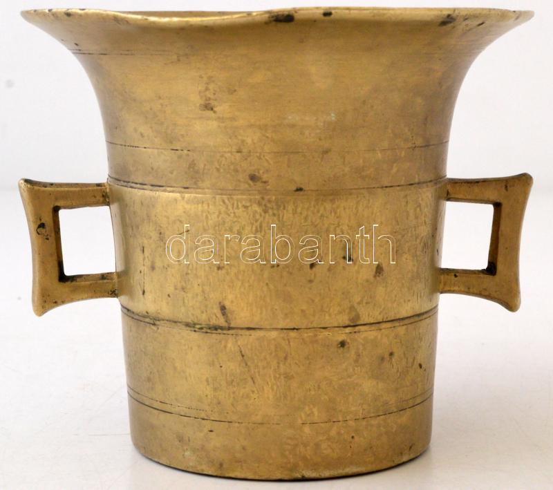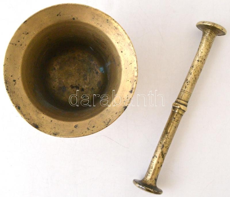 Leírás: Bronz füles mozsár törővel, m:11 cm, törő:21 cm