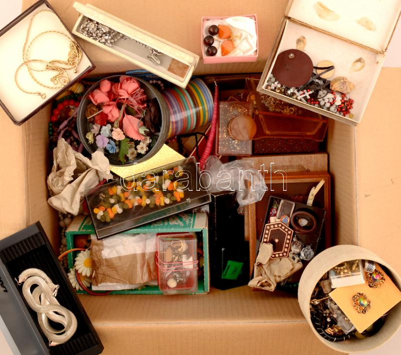 Gigantikus méretű ékszer és bizsu tétel. Nagy doboznyi vegyes bizsu. Nyaklánc, karkötő, fülbevaló, bross, a XX. sz második feléből, néhány csont, borostyán, zománc tárgy is. sok fűzni való gyöngy, óriási anyag.