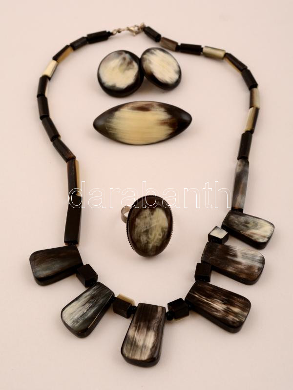 Leírás: Szaruból készült ékszerszett: nyaklánc, fülklipsz, gyűrű, bross, 4 db