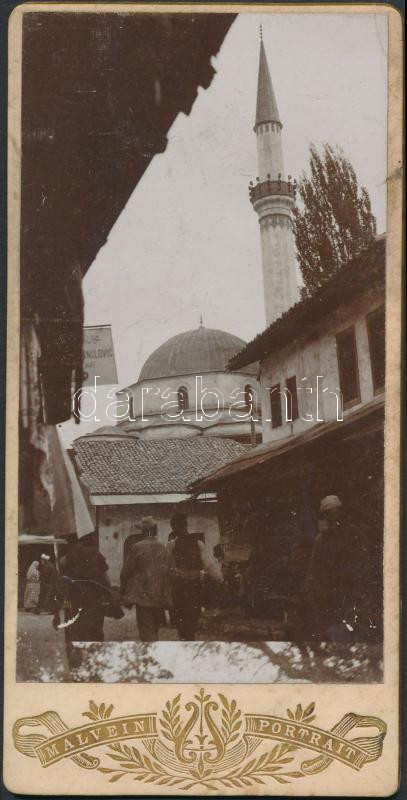 Leírás: 1907 Sarajevo, Utcakép, Begova dzamija. Keményhátú kabinetfotó, hátoldalán feliratozva, 16.5×8 cm