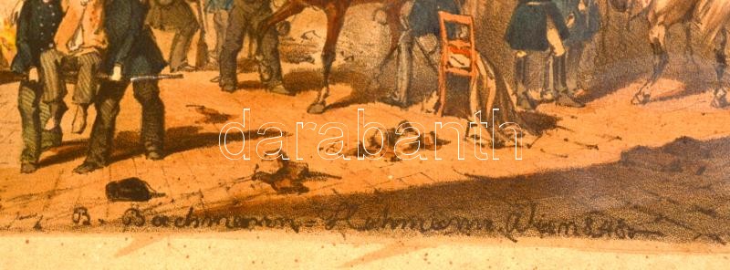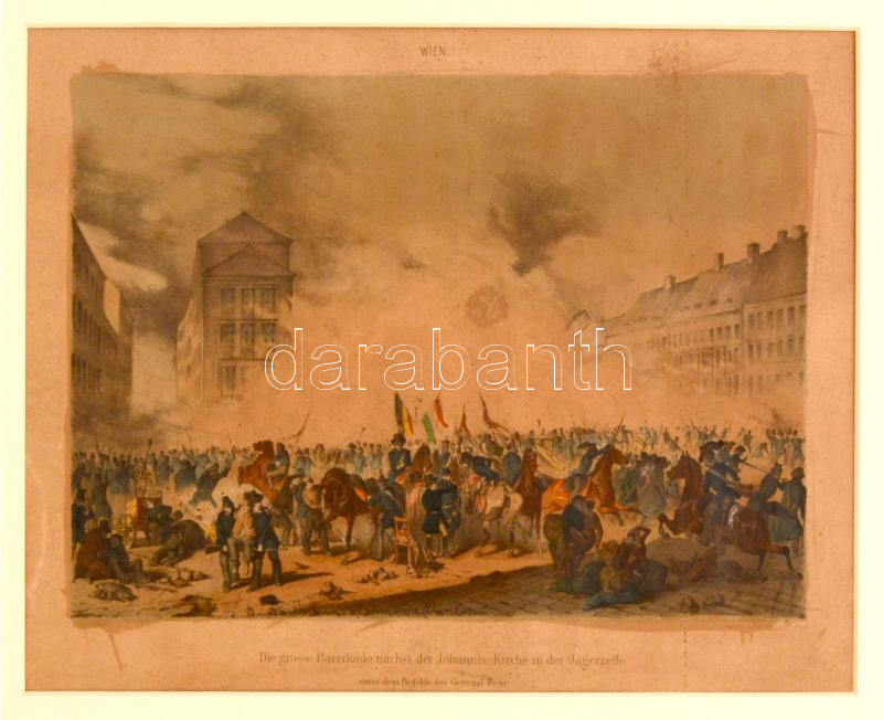 B. Bachmann-Hohmann (XIX. sz. második fele) - G. Veith - L. Förster: A nagy barikád a Szent János templom mellett, vadász ezreddel a sorok között, Bem tábornok parancsnoksága alatt, papír, színezett litográfia, jelzett a metszetten, paszpartuban, 27x35 cm./ B. Bachmann-Hohmann (Second part of the 19th century) - G. Veith - L. Förster:The great barricade next to the St. John's Church in the Hunter line under the command of General Bem, paper, colored litography, signed on the litography, in paspartu, 27x35 cm.