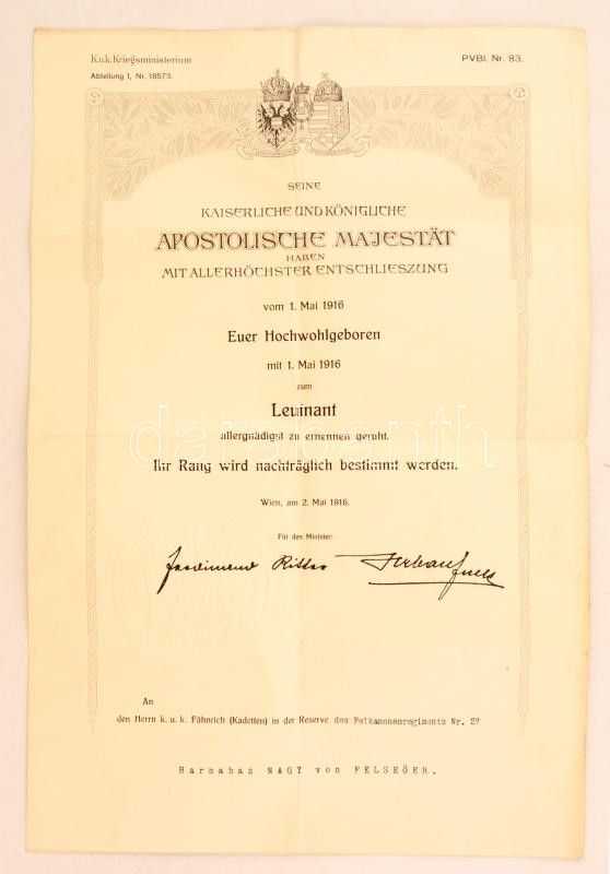 1915 Magyar katona tartalékos hadnagyi kinevezése. Hadügyminisztériumi... https://www.darabanth.com/hu/276-Gyorsarveres/276.0/Festmeny-mutargy-papirregiseg-egyeb/Militaria~200026/1915-Magyar-katona-tartalekos-hadnagyi-kinevezese-Hadugyminiszteriumi-szarazpecsettel-Appoi~II1409734