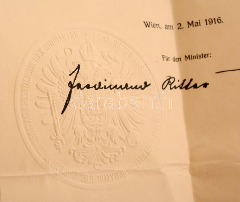 Leírás: 1915 Magyar katona tartalékos hadnagyi kinevezése. Hadügyminisztériumi szárazpecséttel / Appointing warrant for leutnant