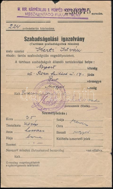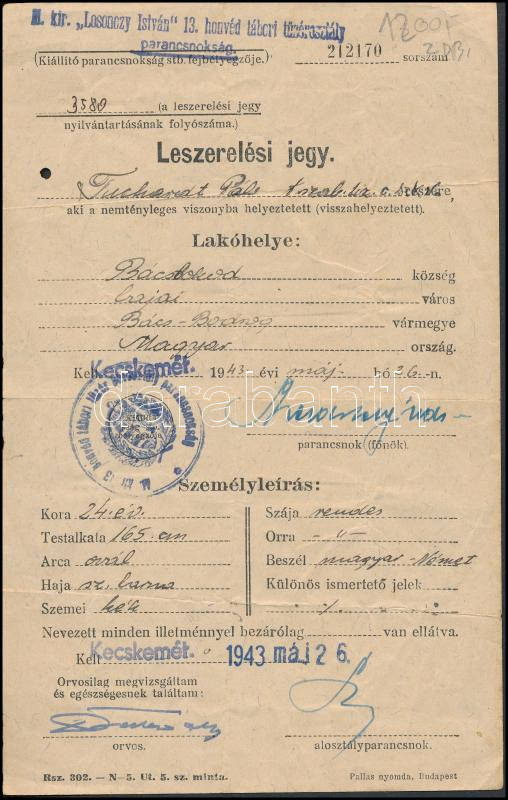 1940, 1943 Katona számára kiállított szabadságolási és leszerelési jeg... https://www.darabanth.com/hu/276-Gyorsarveres/276.0/Festmeny-mutargy-papirregiseg-egyeb/Militaria~200026/1940-1943-Katona-szamara-kiallitott-szabadsagolasi-es-leszerelesi-jegy-2-db~II1412349