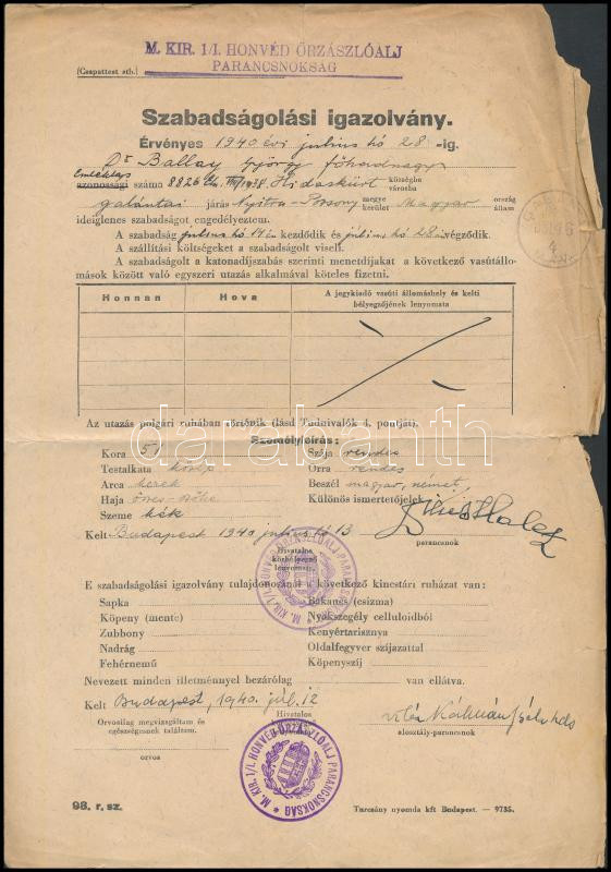 Leírás: 1940 A M. kir. 1/I. honvéd őrzászlóalj szabadságolási igazolványa, hajtva