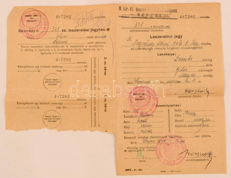Leírás: 1944 Vitéz Mérey László (későbbi altábornagy, Pest-Pilis-Solt-Kiskun főispánja) Leszerelési jegye, 19x12cm