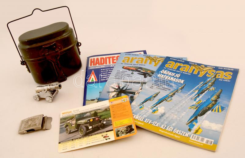 Leírás: Militária tétel: Katonai újságok, kis ágyú, övcsat, csajka