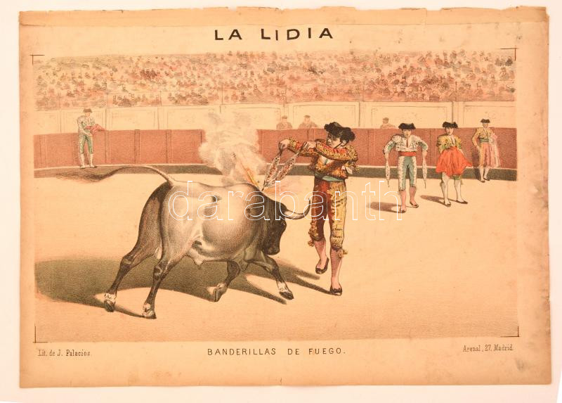 1883 Banderillas de Fuego, az égő banderillák,poszter, La Lidia folyóirat melléklete, papír, litografia, szakadásokkal, 54x38 cm./ 1883 Banderillas de Fuego, the firing banderillas, poster, supplement of the review of La Lidia, paper, litography, with tearings, 54x38 cm.