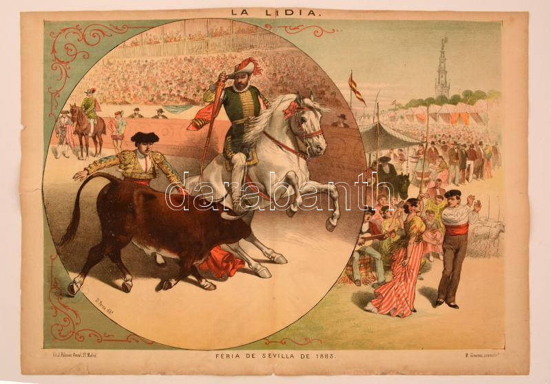 1883 Féria de Sevilla/ Sevilla-i vásár, 1883-as posztere, La Lidia folyóirat melléklete, papír, litográfia, sérülésekkel, 54x74 cm./ 1883 Féria de Sevilla/ poster of Seville Fair from 1883, supplement of the review of La Lidia, paper, litography, with damages, 54x74 cm.