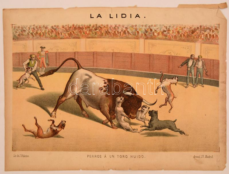 1883 Perros Á Un Toro Huido, bikaviadal kutyákkal poszter, La Lidia folyóirat melléklete, papír, litográfia, sérülésekkel, rossz állapotban, 54x38 cm./ 1883 Perros Á Un Toro Huido, poster of bullfight with dogs, supplement of the review of La Lidia, paper, litography, with damages, in bad condition, 54x38 cm.