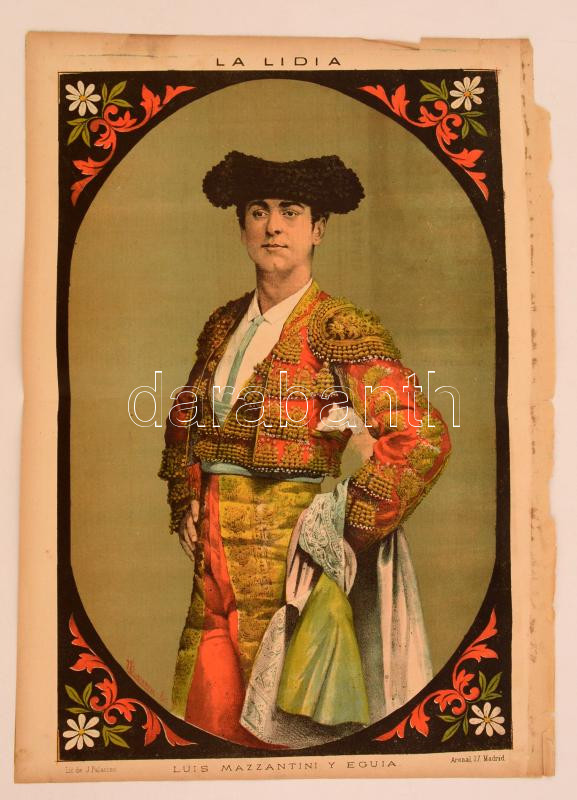 1884 Luis Mazzantini Y Eguia (1856-1926) spanyol toreador (torero) posztere, La Lidia folyóirat melléklete, papír, litográfia, kisebb szakadással a szélein, 54x38 cm./ 1884 Luis Mazzantini Y Eguia (1856-1926) poster of spanish bullfighter (torero), supplement of the review of La Lidia, paper, litography, with some tears, 54x38 cm.