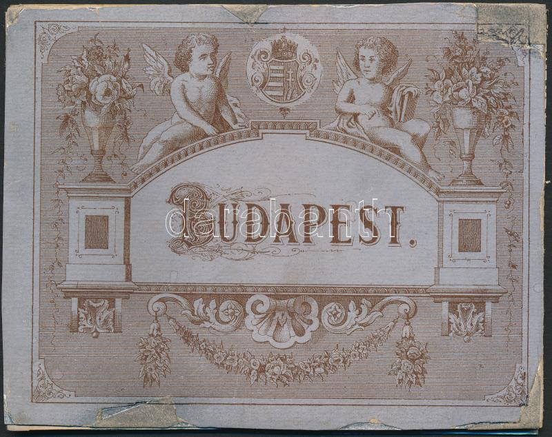 1885 Budapesti Országos Általános Kiállítás, 9 oldalas kihajtható képes litho leporello a főváros nevezetességeivel, több helyen javítva / ragasztva 10.5×13.5 cm