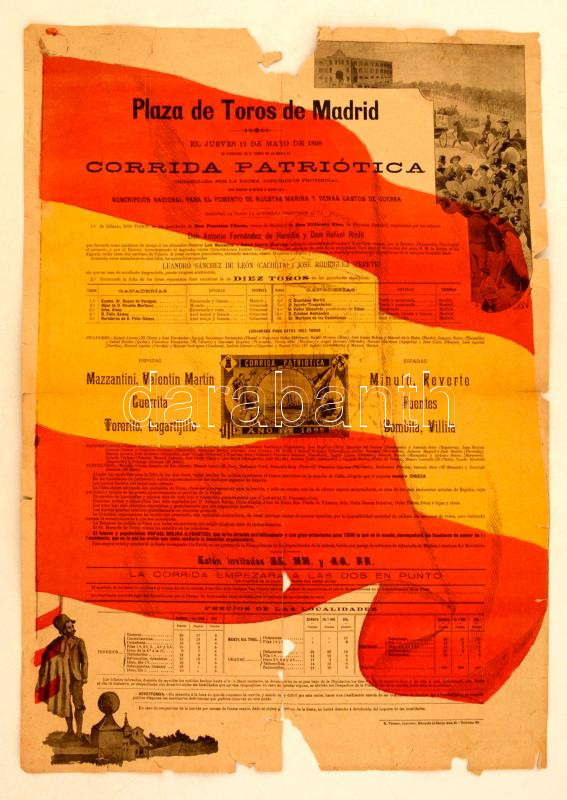 1898 Egy régi bikaviadal plakátja, Madrid, Plaza de Toros, rossz állapotban, 40 x 58 cm. /