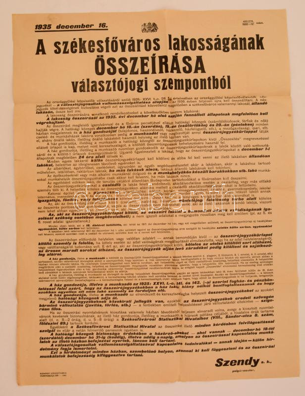 Leírás: 1935 A székesfőváros összeírása választójogi szempontból, plakát, pici sérülésekkel a hajtások mentén, 62x47 cm.