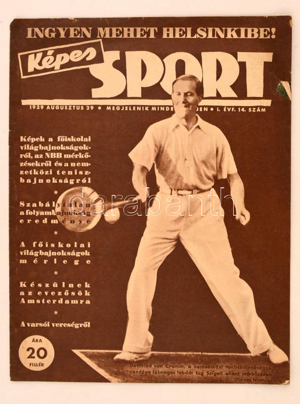 Leírás: 1939 A Képes Sport I. évfolyamának 14. száma, címlapon Gottfried von Cramm teniszbajnokkal