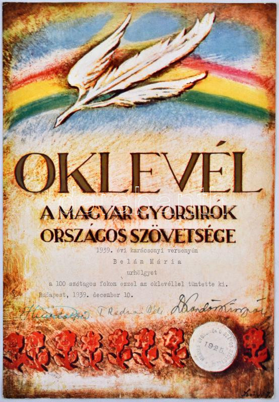 Leírás: 1939 Bp., Oklevél a Magyar Gyorsírók Országos Szövetségének karácsonyi versenyén való részvételért, aláírásokkal
