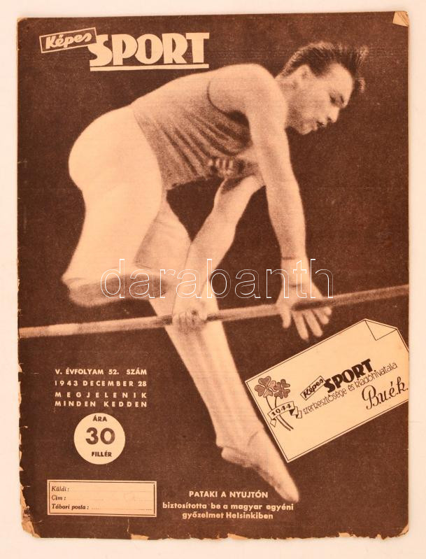 1943 A Képes Sport V. évfolyamának 52. száma, címlapon Pataki a nyújtó... https://www.darabanth.com/hu/276-Gyorsarveres/276.0/Festmeny-mutargy-papirregiseg-egyeb/Nyomtatvanyok~200028/1943-A-Kepes-Sport-V-evfolyamanak-52-szama-cimlapon-Pataki-a-nyujton~II1414400