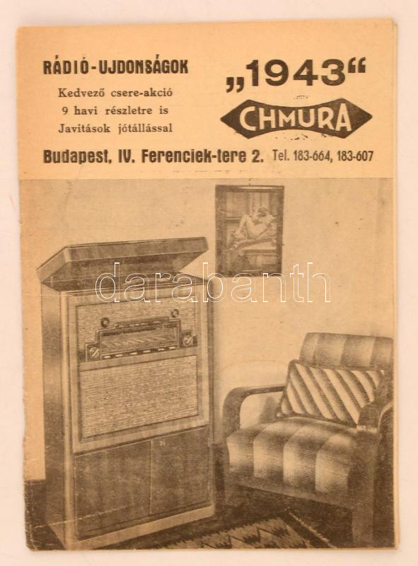 1943 Chmura rádió újdonságok képes katalógus https://www.darabanth.com/hu/276-Gyorsarveres/276.0/Festmeny-mutargy-papirregiseg-egyeb/Nyomtatvanyok~200028/1943-Chmura-radio-ujdonsagok-kepes-katalogus~II1413820